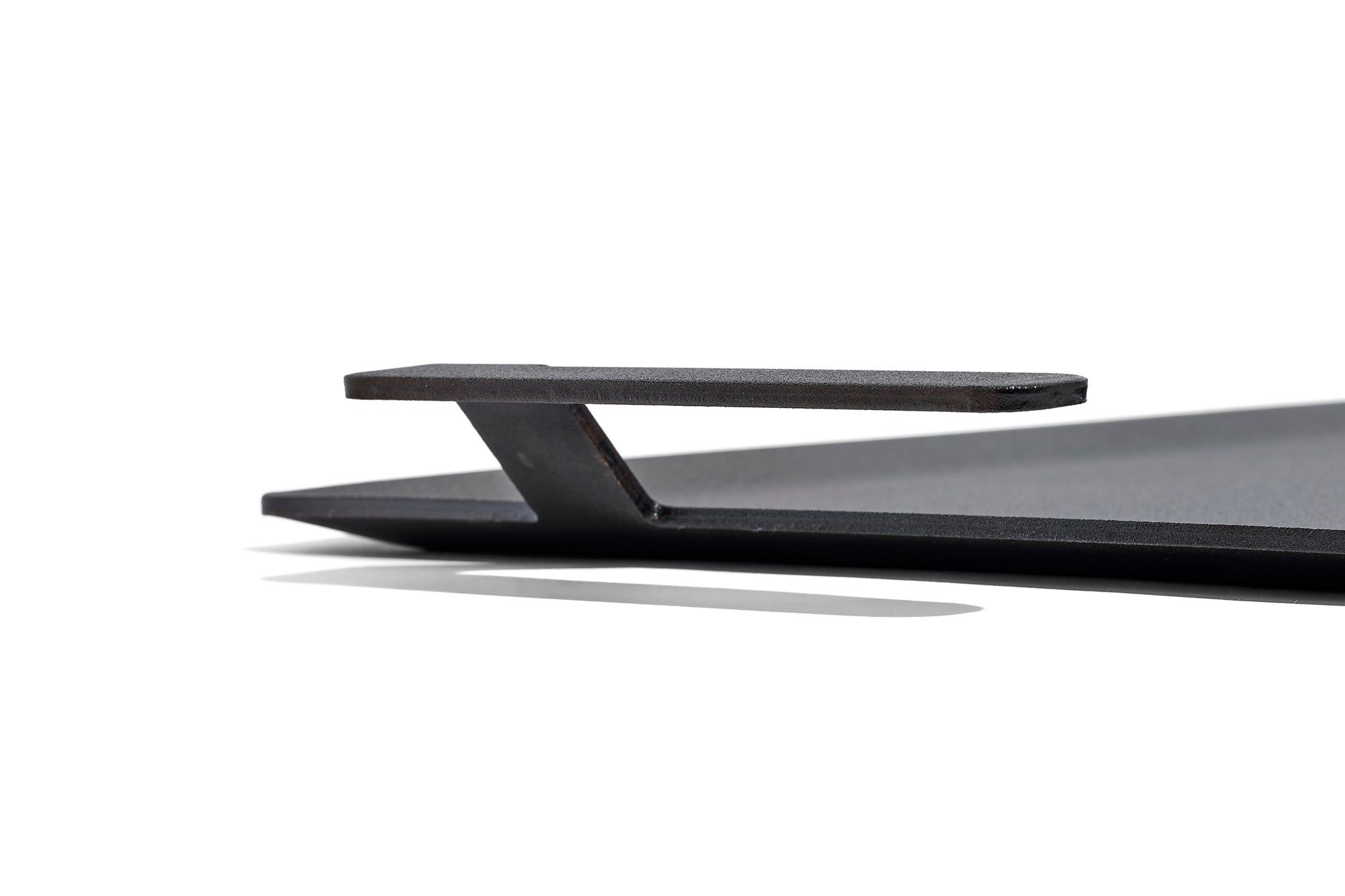 • A close up on the handle of a Made In Seasoned Carbon Steel Griddle in front of a white background.